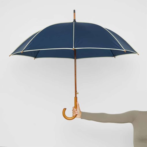 Det böjda trähandtaget ligger bekvämt i handen och ger ett stabilt grepp även i blåsigt väder. Formen gör det enkelt att bära paraplyet över underarmen när du behöver ha händerna fria.