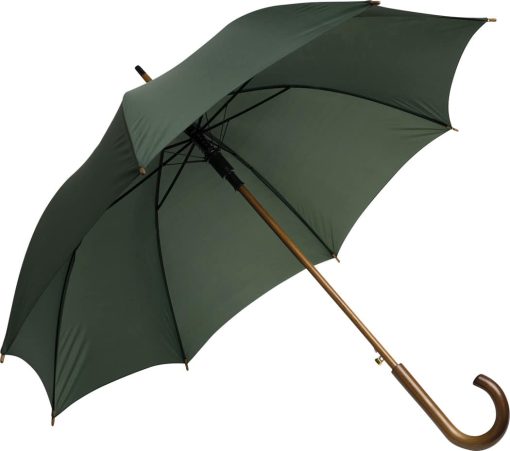 Ett mörkgrönt paraply med djup, naturnära färg och klassiska trädetaljer.