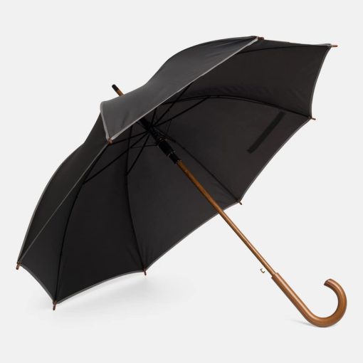 Paraplyet har automatisk öppning och en stabil konstruktion med trädetaljer, vilket gör det till ett pålitligt val i regnigt väder.
